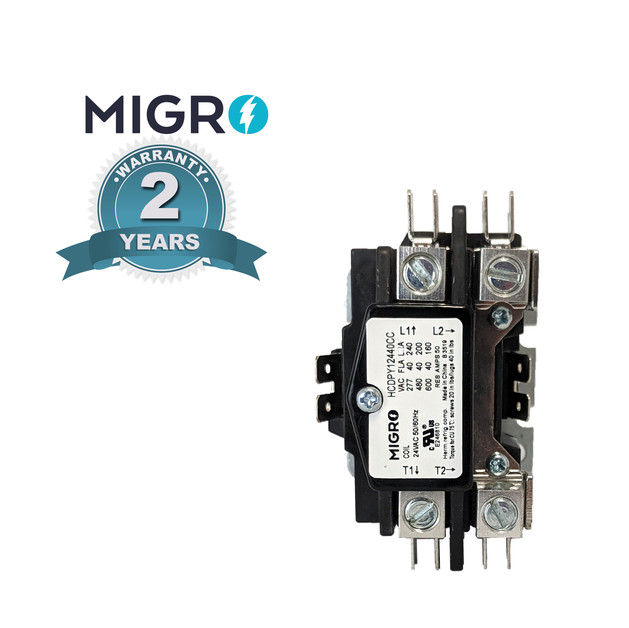 This contactor is a heavy duty enclosed replacement for all two-pole contactors rated at 40 Amps or less which have 24 volt coils. This contactor is rated at 40 Amps and has a 24 Volt coil. This contactor has a heavy lug terminal and 4 male quick connect ¼” terminals on each line voltage connection to provide maximum wiring flexibility. The two terminals for the low voltage coil each have double ¼” male quick-connects. The contact mechanism is enclosed to keep out insects and debris, but the visible plunger provides positive verification that the contacts are pulled in. The coil is encapsulated with no exposed tape wrapping. The mounting base measures 2-5/16” X 2” with four oblong mounting holes 1-5/8” x 1-5/8” on center. There are also four slots in the base to provide many mounting options. This part replaces most residential two-pole contactors. This part is covered by the exclusive Migro two-year limited replacement policy. If this part fails within the warranty period from the date of purchase, return the defective part and a copy of the original invoice to the place of purchase for a replacement. Contact the authorized Migro dealer that you purchased the part from for details. Original equipment manufacturer’s brand name(s) and part numbers are used for identification purposes only. This item meets or exceeds original equipment specifications.