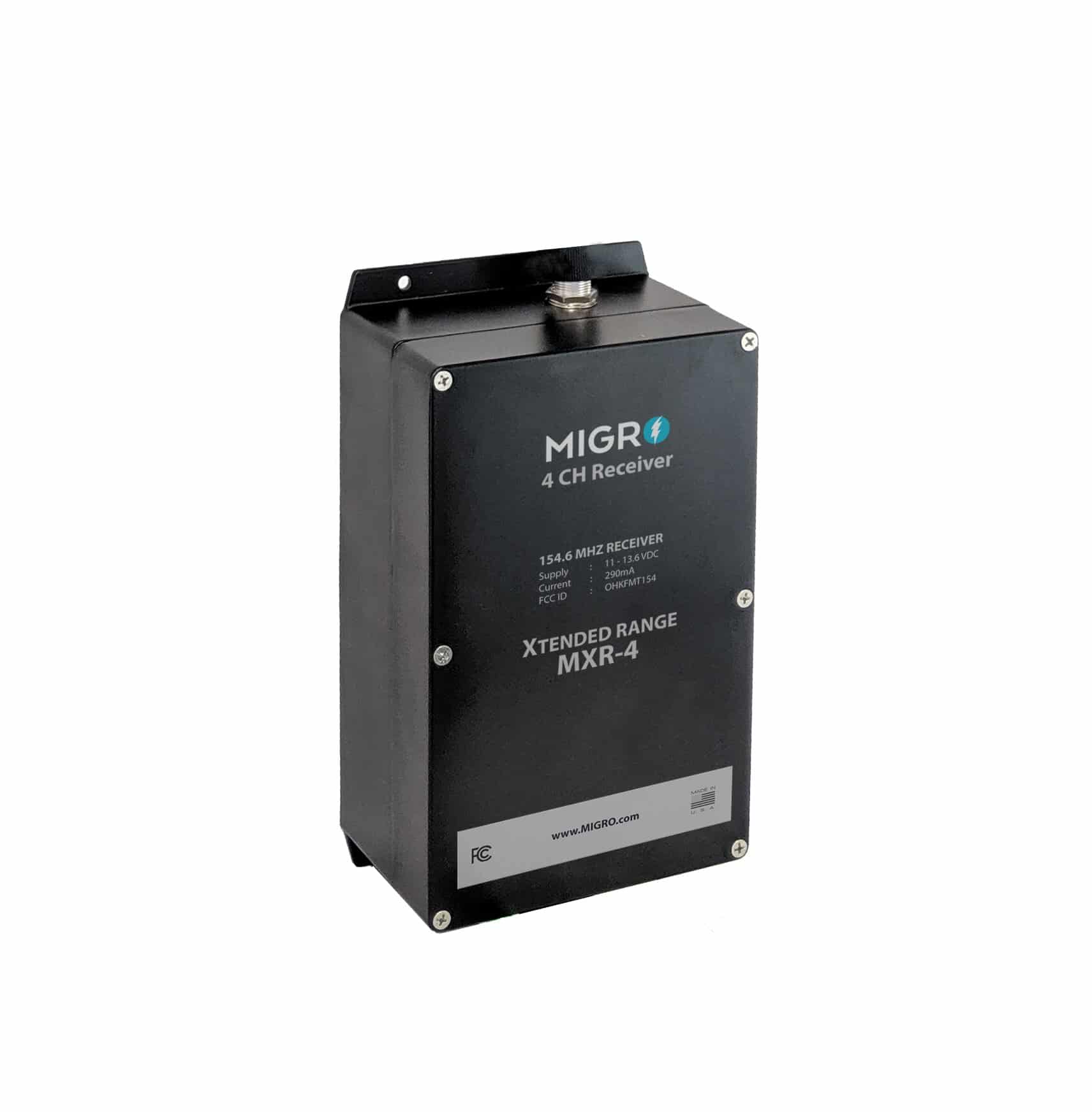 | Up to 10 Km of line-of-sight range with MXT4 Up to 3 Km with handheld device MXT4H Migro Encoding/Decoding technology Four (4) Independent Channels Output mode selection: Latch or Momentary Shielded Metal case NEMA4 – IP65 Antenna 931501 or 931487 (not included) Power: 12 VDC – Solar Ready Dip Switch 12 Bit Code setting Optional repeater if necessary Multiple Transmitters and Receivers Factory pre-configured system, Ready No setup or programming required No fees from carriers, No hacking No software or internet Not limited to line-of-sight communication |